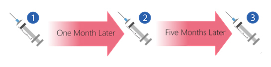 - The complete course of vaccination takes a total of three doses. The second dose is given 1 month after the first, and the third dose is given 5 months after the second.