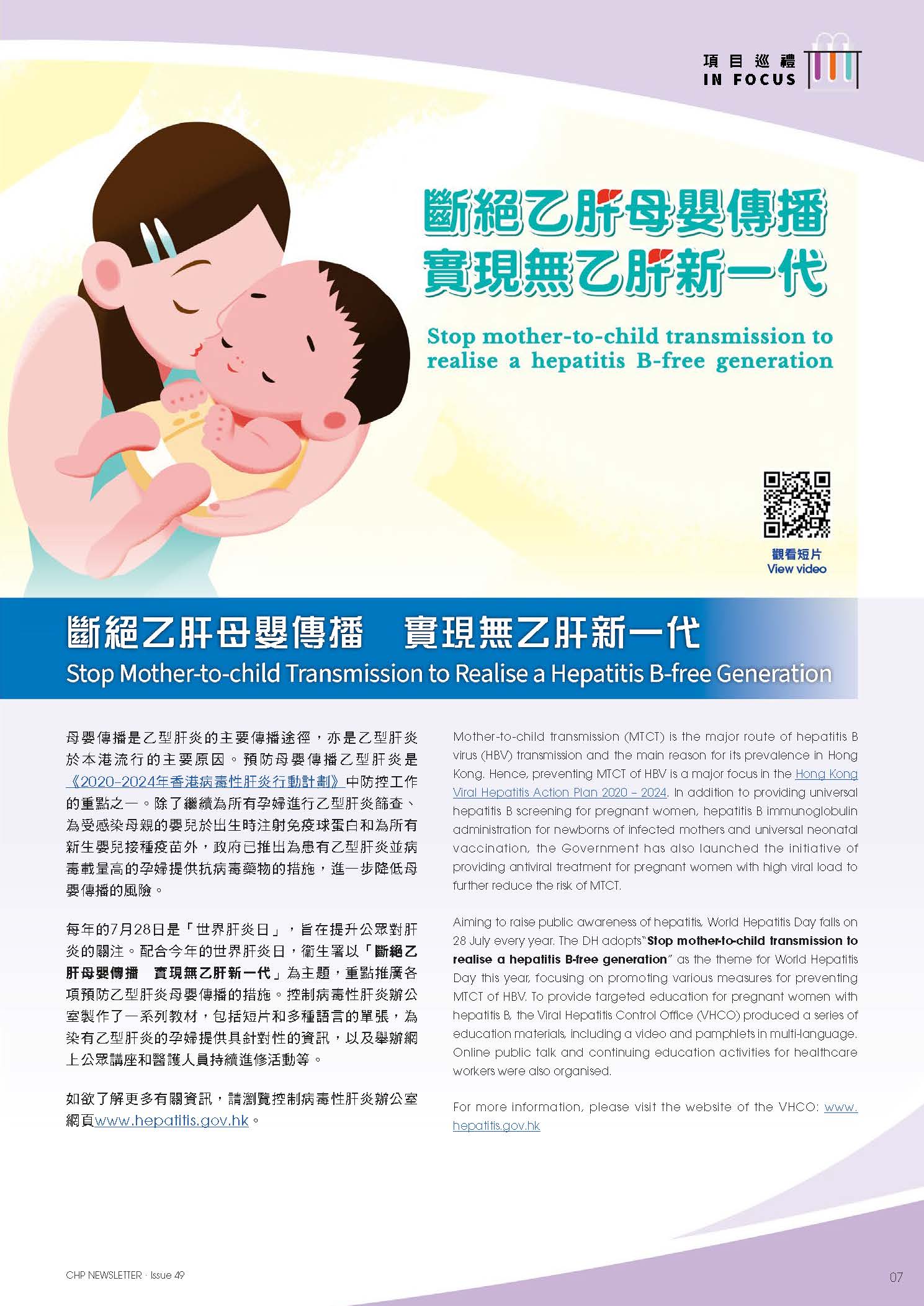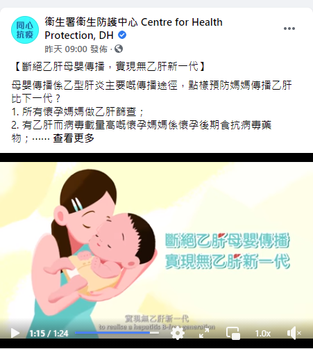 Since 2011, the World Health Organization (WHO) has marked 28 July as World Hepatitis Day to promote and raise public awareness on hepatitis. This year the Department of Health adopts “Stop mother-to-child transmission to realise a hepatitis B-free generation” as the theme, focusing on promotion of various measures for preventing mother-to-child transmission (MTCT) of hepatitis B virus (HBV).