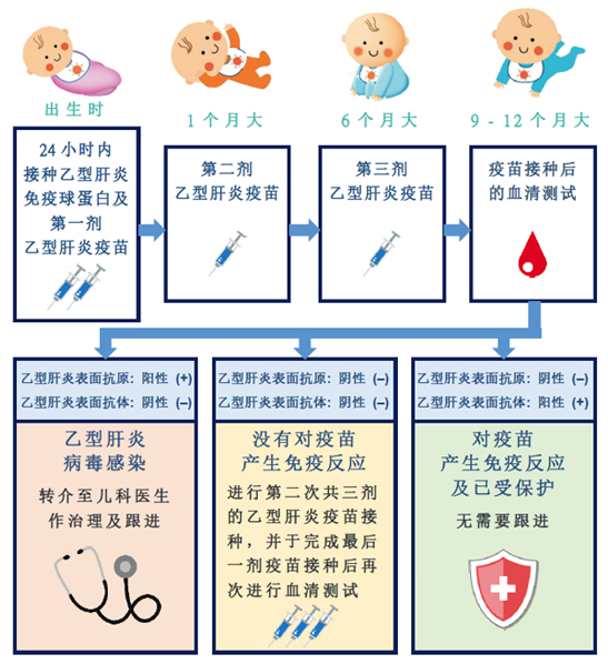 - 无论孕妇是否患有乙型肝炎,所有初生婴儿于出生时均会在医院接种第一剂乙型肝炎疫苗,其后分别于一个月及六个月大时,接种第二及第三剂疫苗。