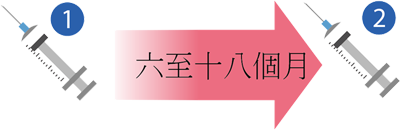 - 整個接種程序共需注射兩劑疫苗,完成第一劑注射後的六至十八個月,便可接種第二劑